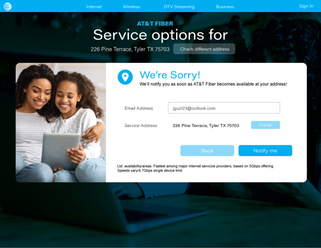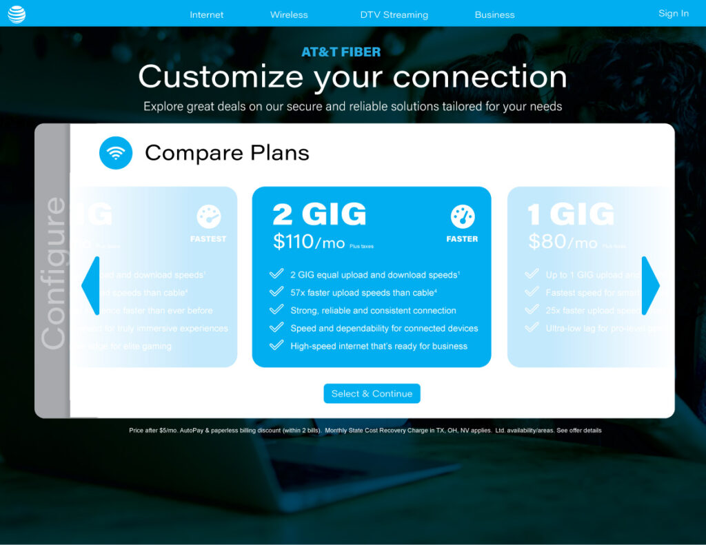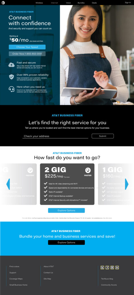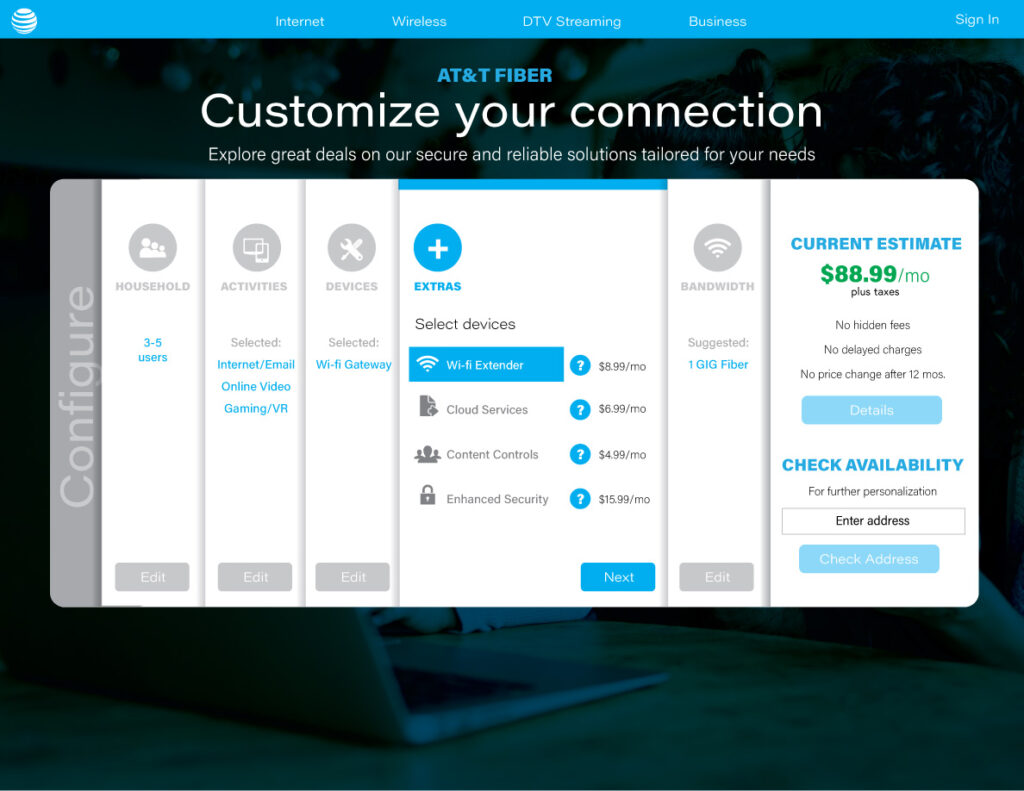 On several occasions I’ve worked with Evolve Digital to help visualize modifications and improvements to the private and business customer’s path through product sign up in support of AT&T. The objective was to consolidate and organize the information in this process to reduce falloff with potential customers – in this case AT&T Fiber. My understanding is these proposed solutions were then shared with their agency and continued from there.